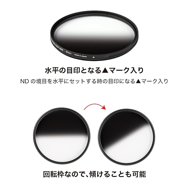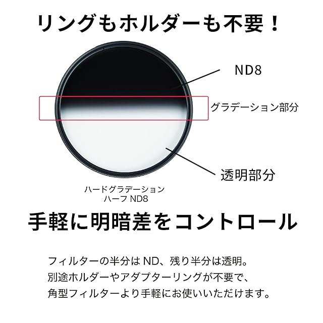 【明暗差を手軽にコントロールできる、丸枠ハーフND】フィルターの半分に露出を調整するND(最も濃い部分がND8・3絞り分減光)、残り半分を透明とすることで、写真の明暗バランスを調整するハーフNDフィルター