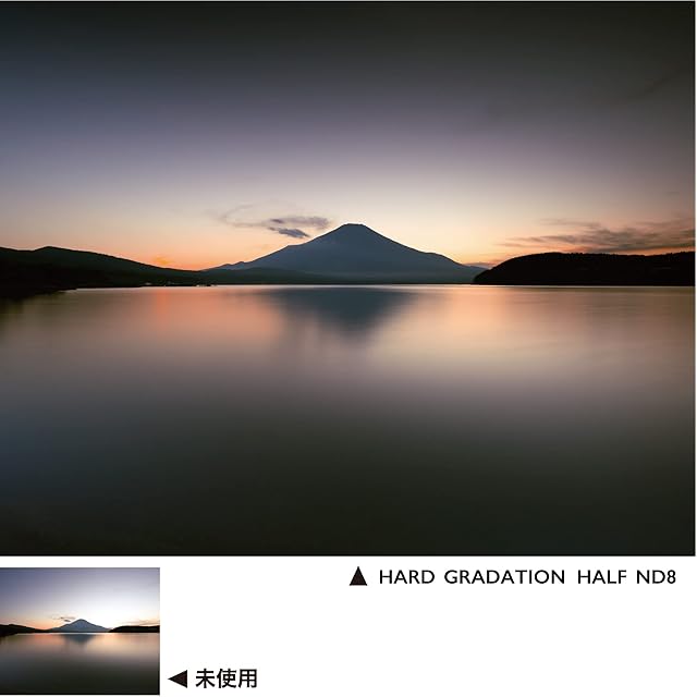 【境目から濃度が濃くなる、ハードグラデーション】NDと透明部分の境目のみにグラデーションがかかり、ND部分のほとんどはND8の濃度で使えるハードグラデーションタイプ。水平線、地平線を構図に入れる日の出・日の入りや、減光したいエリアがはっきりと分かれている場合に適してます。