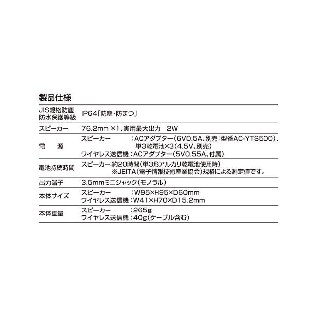 商品名:[山善] キュリオム ワイヤレス 手元スピーカー (AC電源/乾電池 対応) 防水 防塵 YWTS-800W