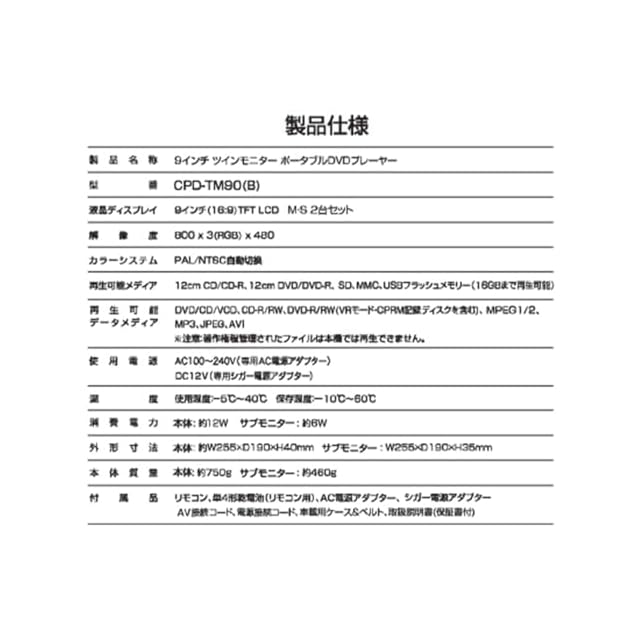商品名:[山善] キュリオム ポータブルDVDプレーヤー CPRM対応 9インチ(16:9) ツインモニター AC/DC対応 TFT液晶 DVD CPD-TM90(B)