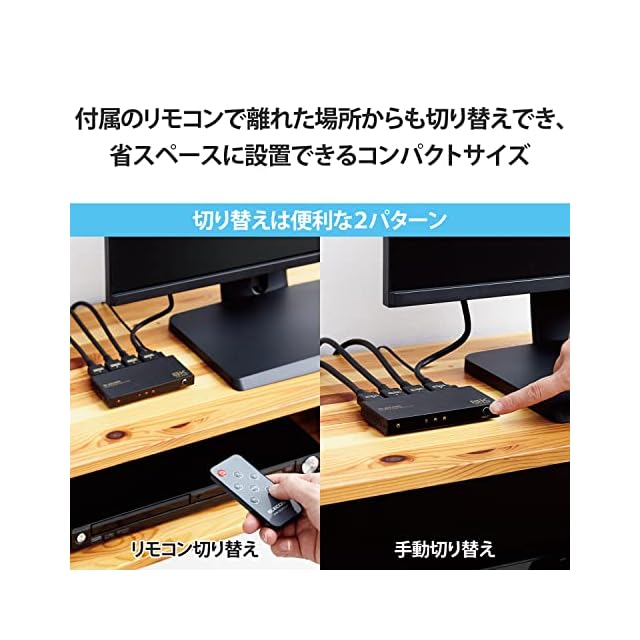 8K60Hzや4K120Hz、HDCP2.3に対応したHDMI(R)2.1ポート不足を解消できるHDMI切替器です。手動切替・自動切替の設定変更や、リモコンの混信を防ぐためのリモコン受信のON/OFFが可能です。専用ACアダプター付属により安定した動作を実現します。放熱効率の良いメタル筐体を採用しています。