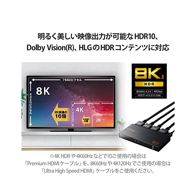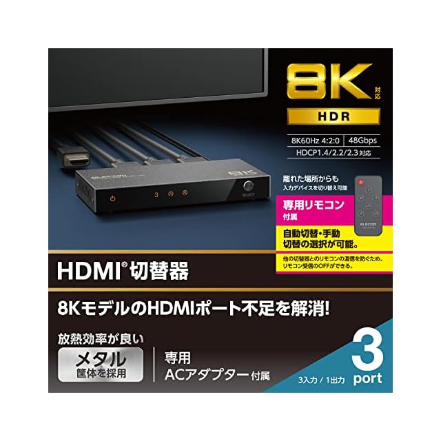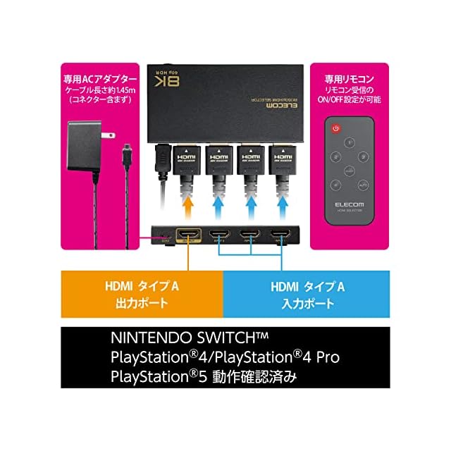 商品名:エレコム HDMI切替器 8K60Hz/4K120Hz対応 【PS5/PS4/PS3/Switch/FireTVStick対応】 3入力1出力 自動/手動切替 8K 4K 対応 ブラック DH-SW8KP31BK