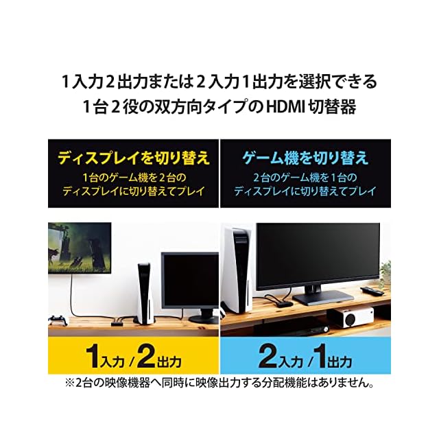 パソコンやゲーム機などの1台のHDMI機器の信号を2台のディスプレイやプロジェクターなどのHDMI搭載映像機器を選択して映像出力したり、パソコンやゲーム機などの2台のHDMI機器の信号を切替えて1台のディスプレイやプロジェクターなどのHDMI搭載映像機器に出力ができます。(CEC対応、ARC対応(IN/OUT2ポート)のみで、HECは非対応。)
