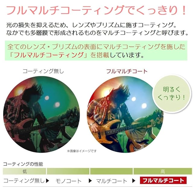 【フルマルチコーティングとは】光の透過率を高め、フレアやゴーストを抑えるコーティングを全レンズ面とプリズムの入光面に施しています。