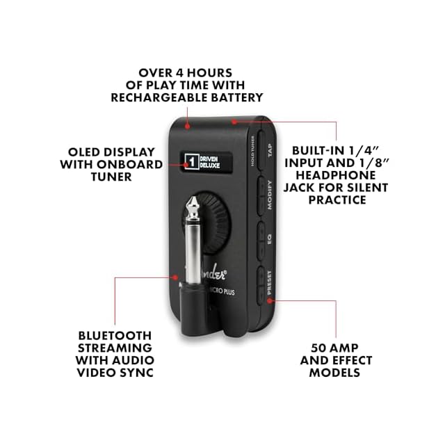 Mustang Micro Plusは、プレイヤーが愛するMustang Microに新たな機能とサウンドを搭載し、さらなる進化を遂げた超小型のパーソナルギターアンプです。25種類のアンプモデルと25種類のエフェクトモデルを内蔵し、Fender Tone Appに対応した編集と保存が可能な100のプリセットスロット、内蔵チューナー、ディスプレイをご用意しています。<br />Mustang Micro Plusには、お気に入りの曲に合わせてセッションするのに必要な機能がすべて内蔵されています。Mustang Micro Plusをギタージャックに直接接続し、イヤホンやヘッドホンを接続するだけで、あらかじめ用意された極上のファクトリープリセットの中から好きなサウンドを選んでみましょう。さらにBluetoothオーディオストリーミング機能を搭載しているので、お気に入りの曲やビデオに合わせてリアルタイムでジャムセッションを楽しむことが可能です。