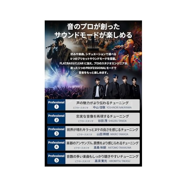 【音のプロが創ったサウンドモードが楽しめる】有名アーティストの楽曲を手がける「ビクタースタジオのエンジニア5名がそれぞれの音づくりの個性を盛り込んでチューニングを行った、5つの「PROFESSIONAL」サウンドモードを搭載。FLAT/BASS/CLEARモードと 合わせて、好みや楽曲、シチュエーションに応じてサウンドモードを楽しめます。