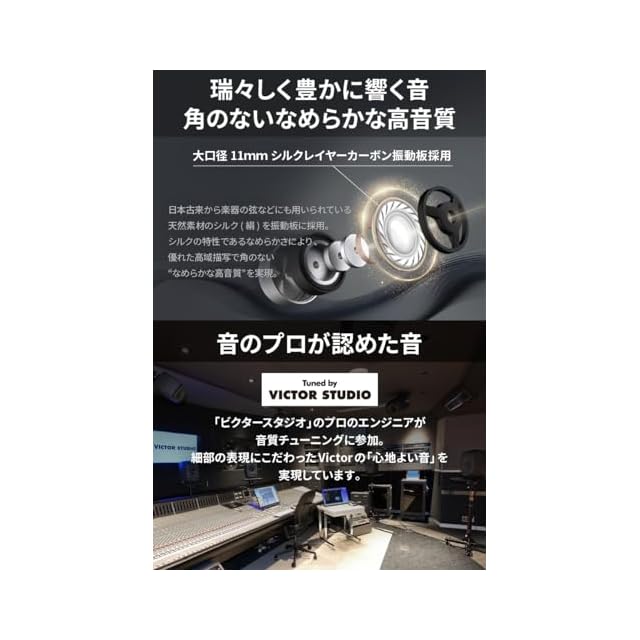 【音のプロが認めた音】国内最高峰クラスの設備・技術を誇る「ビクタースタジオ」のエンジニアが音質の監修に参加。当社が培ってきた音響設計技術に加えて、スタジオエンジニアならではの細かなこだわりを音づくりに反映し、プロが認めた‟心地よく音楽を楽しめる音”に仕上げました。音のプロが認めた音には「Tuned by VICTOR STUDIO」のロゴを付与しています。
