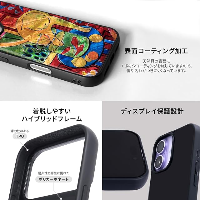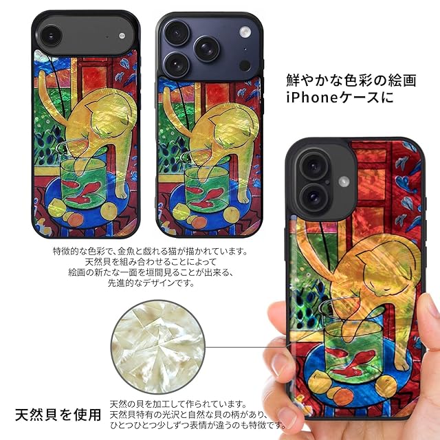 商品名:ikins iPhone 17 用 天然貝ケース [ パール 表面コーティング 高耐久 防塵 ハイブリッドフレーム ストラップホール付き 無線充電対応 ] 魚と猫 I28125i17 【国内正規品】