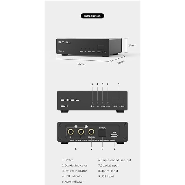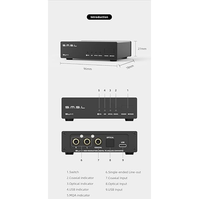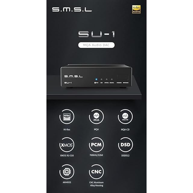 MQA CD対応:CDプレーヤー+MQA対応DAC,CDプレーヤーのデジタル出力(光または同軸)をMQA対応DACに供給することができます。 コーダーです。MQAデコーダーは、元のハイレゾ信号を復元して聞くことができます。 SMSL SU-1は、MQA CDに対応しています。