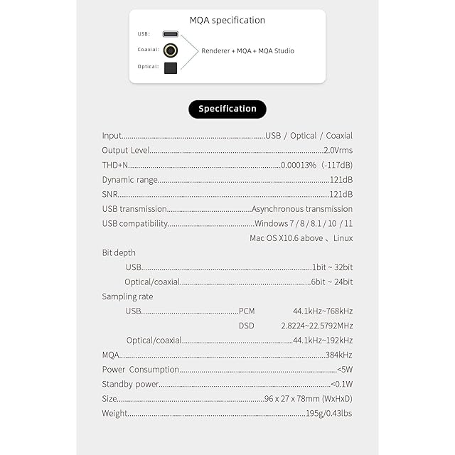 仕様:<br> 入力:USB/光/同軸<br> 出力レベル:2.0VRMS <br> thd+n:0.00013%(-117db)<br> ダイナミックレンジ:121db <br> SNR:121db <br> USB送信:非同期伝送<br> USB互換性:Windows 7/8/8.1/10/11 Mac 0s x10.6上記のlinux <br> ビット深さ:<br> USB:1bit-32bit <br> 光/同軸:6bit-24bit <br> サンプリングレート:USB PCM 44.1KHZ-768KHz/DSD 2.8224-22.5792MHz <br> MQA:384kHz <br> 消費電力<5W <br> スタンバイパワー<0.1W <br> サイズ:96 x 27 x 78mm(wxhxd)<br> 重量:195g/0.43lbs