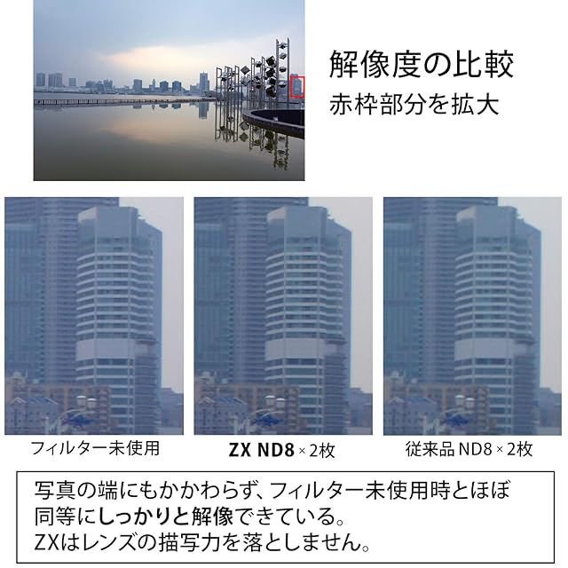 【画質を落とさず光量を1/8(3絞り分)に減少】ZX[ゼクロス] ND8は、レンズに入る光量を1/8(3絞り分)に減少。高い解像力と忠実な色再現性を実現した、Kenko最高画質のNDフィルターです。