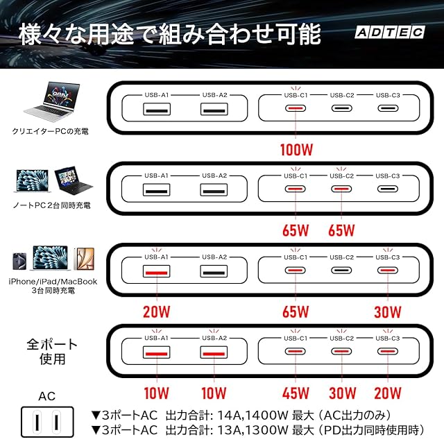 AC100V×3出力と130W PD5ポート出力対応の一体型PD充電器です。 GaN (窒化ガリウム)を搭載し高効率・高耐久性を実現!! 2ポート出力時には65W+65Wで、同時に2台のノートパソコンを充電できます。5ポート出力時には45W+30W+20W+10W+10Wなど、タブレット、Switch、スマホ、イヤホン、ウォッチなど、様々な機器を一台で充電可能です。オフィスや家庭のデスクでは、この一台でパソコンやスマホに加え、ACで動く液晶モニタ、照明、扇風機、デスクトップパソコン、ACアダプターなど、一般的なACコンセントに接続できる機器を利用できます。また、サージガードなどの安全装置も搭載されています。デスク周りをスッキリ片づけたい方に最適なマルチポートPD充電器です。<br>入力端子AC100-125V 50/60Hz <br> 電圧特記事項参照<br> 使用温度範囲0 ~ 35℃<br> 外形寸法163(W)×103(D)×32(H)mm<br> 重量約546g<br> 期間1年間<br> 特記事項【出力電圧・電流】<br> ◇AC出力<br> ▼3ポートAC 出力合計: 14A,1400W 最大 (AC出力のみ)<br> ▼3ポートAC 出力合計: 13A,1300W 最大 (PD出力同時使用時 130W 最大)<br> <br> ◇PD出力電圧 Type-C<br> ▼C1/C2/C3 出力: 5V 3A or 9V 3A or 12V 3A or 15V 3A or 20V 5A (100W 最大)<br> <br> ◇出力電圧 Type-A<br> ▼A1/A2 出力: 5V 3A or 9V 3A or 12V 2.5A or 20V 1.5A (30W 最大)<br> <br> ◇PD出力<br> ▼C1+C2 出力: 65W+65W<br> ▼C2+C3 出力: 65W+30W<br> ▼C1+C3 or USB-A1 or USB-A2 出力: 100W+30W<br> ▼C1+C2+C3 or USB-A1 or USB-A2 出力: 65W+30W+20W<br> ▼C1+C2+C3+USB-A1 or USB-A2 出力: 45W+30W+20W+20W<br> ▼C1+C2+C3+USB-A1+USB-A2 出力: 45W+30W+20W+10W+10W<br> ▼DC 合計出力: 130W 最大<br>