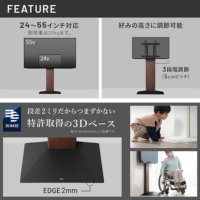 【対応テレビサイズ】24~55インチ(20kg相当)まで ※テレビの取り付け可否につきましては、メーカーのホームページ「WALLテレビ対応表」をご覧ください。