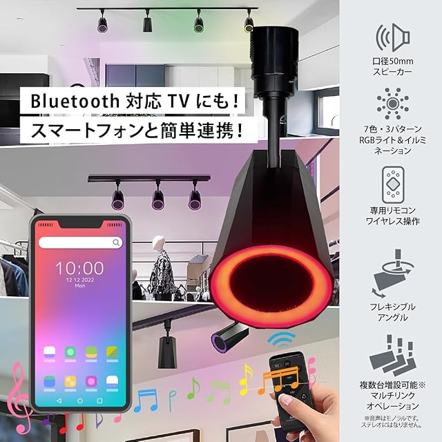 【 特 長 】 ◆RGBイルミネーションと高音質スピーカーを組み合わせたLED一体型ワイヤレススピーカー ◆天井吊り下げ型のワイヤレスサウンドシステム ◆ライティングダクト接続タイプ ◆口径50mmスピーカー搭載 ◆イルミネーションは7色(赤/緑/青/白/黄/水色/紫)・3パターン(グラデーション/リズム連動/サークル) ◆専用リモコン付き ◆複数台増設可能 ◆2台以上のスピーカーをリンクさせて1つのリモコンで操作可能