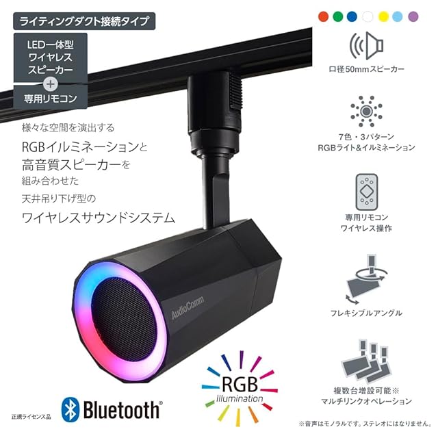 オーム(OHM)オーム電機AudioComm スピーカー付きライト レールライト用 イルミネーション 7色調色 ワイヤレススピーカー 音楽 連動 LED スポットライト レールスピーカー ライティングダクト接続タイプ ブラック ASP-WR200N 03-2950 | LIS MART