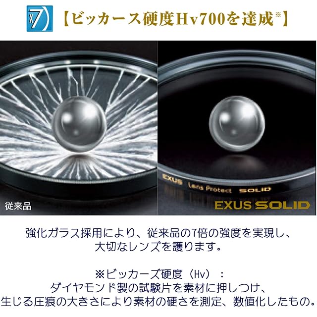 【ピッカーズ硬度Hv700を達成】強化ガラス採用により、従来品の7倍の強度を実現し、大切なレンズを護ります。