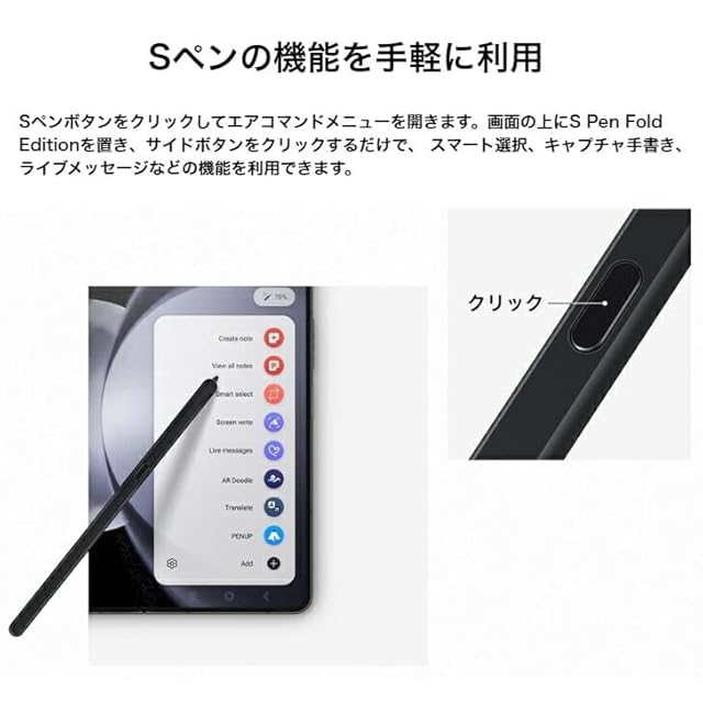 ・Sペンの機能を手軽に利用 Sペンボタンをクリックしてエアコマンドメニューを開きます。画面の上に S Pen Fold Editionを置き、サイドボタンをクリックするだけで、スマート選択、キャプチャ手書き、ライブメッセージなどの機能を利用できます。
