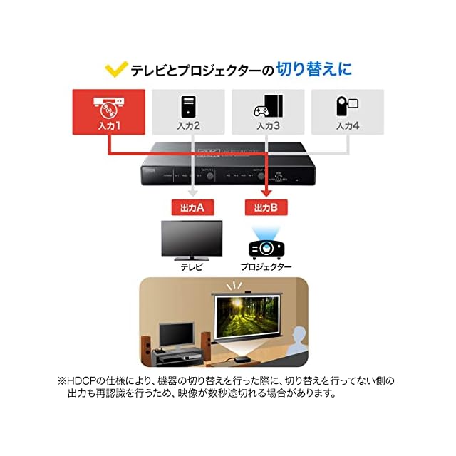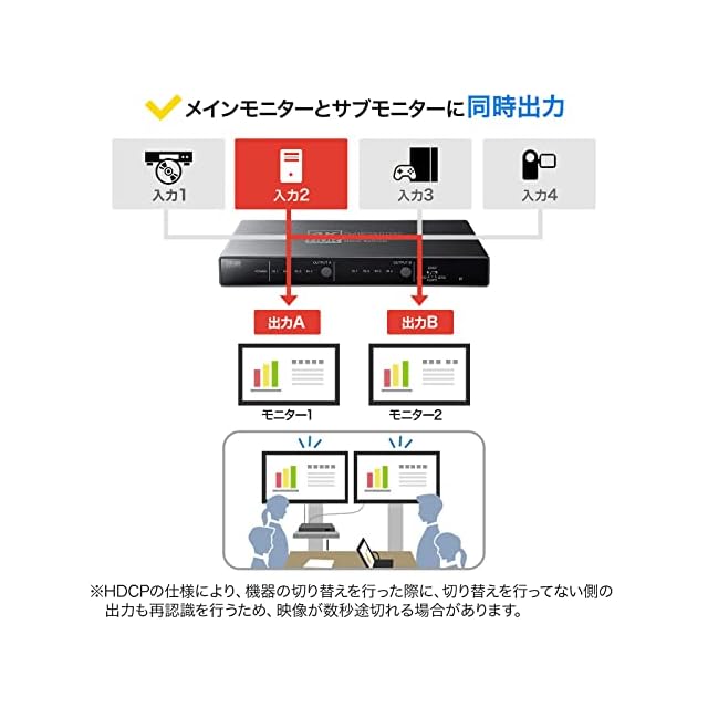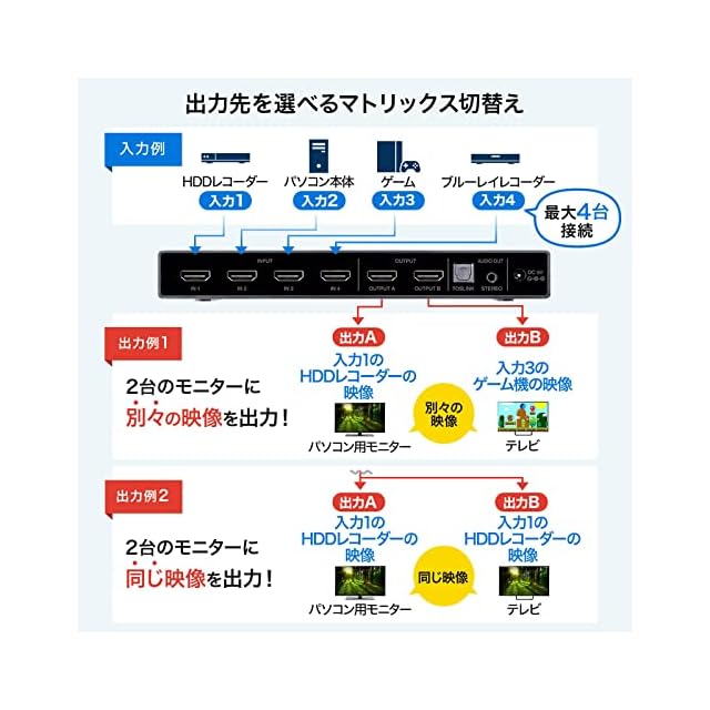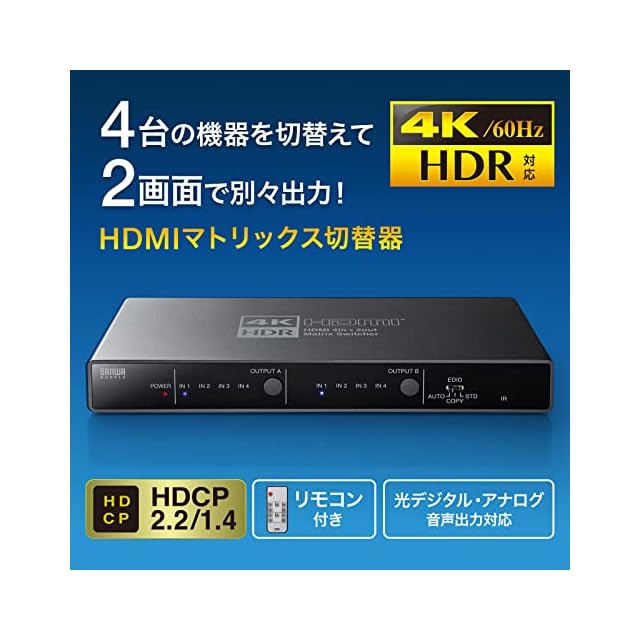 商品名:サンワサプライ HDMIマトリックス切替器(4入力・2出力) 4K・HDR・光デジタル出力付き SW-HDR42H