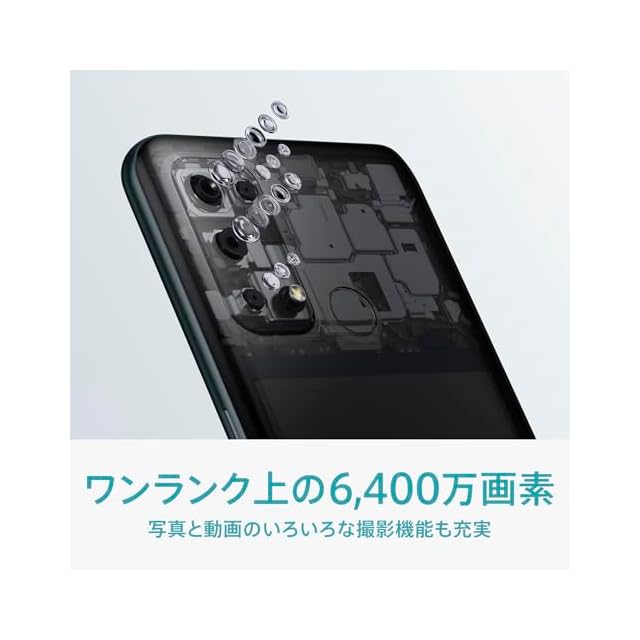 カメラ: [メイン] 約6,400万画素 (F値1.7) [超広角] 約800万画素 (F値2.2 / 画角119°) [モノクロ] 約200万画素 (F値2.4) [マクロ] 約200万画素 (F値2.4) [インカメラ]:約1,600万画素 (F値2.0)