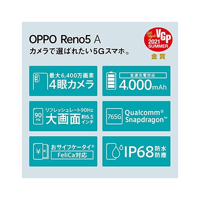 商品名:OPPO Reno5A アイスブルー CPH2199 docomo/au/SoftBank/Rakuten Mobile 回線対応 5G SIMフリー版 おサイフケータイ FeliCa