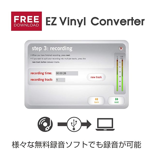 本機の背面にUSB端子を搭載、付属のUSBケーブルで接続して、レコードの再生音をデジタル録音ができる。さらにAUX入力を通してスマートフォンやCD、カセットなどの外部音源からの音声も録音可能