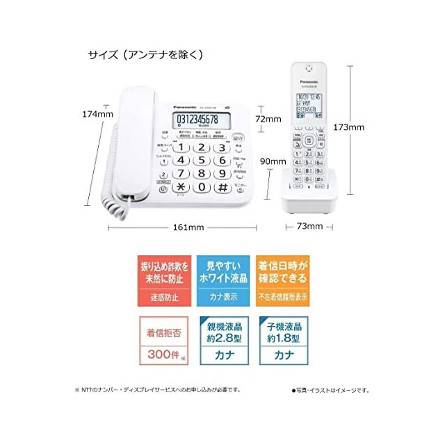 外形寸法(高さH×幅W×奥行D)(mm): 親機:約72×161×174(アンテナを除く)、 子機:約173×49×25、 充電台:約47×73×90