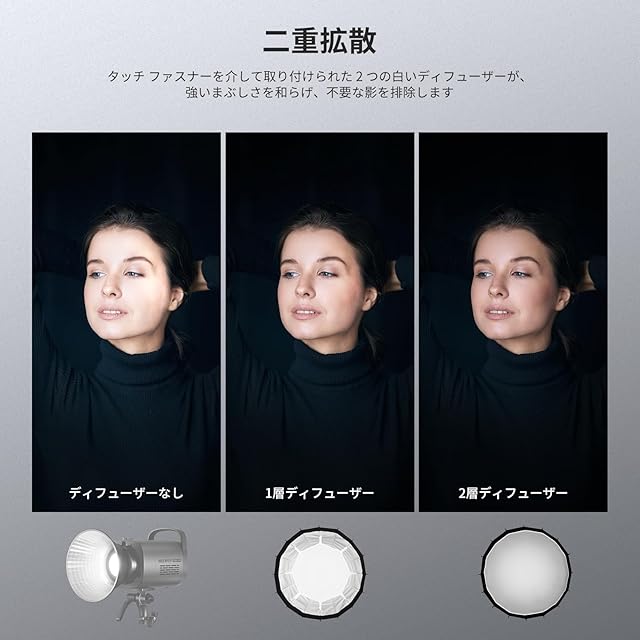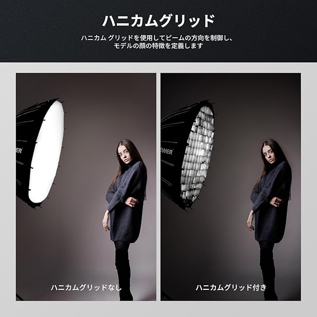 【カスタマイズ可能なハニカムグリッドとディフューザー】ハニカムグリッドを使用すると、光の形状をより限定して指向性を持たせることができ、ビーム角度を45°に集中させることができます。これにより、写真家はモデルの顔の構造を定義する劇的で表現力豊かな光の効果を得ることができます。2枚の高品質ディフューザーを組み合わせて自由に使えます。