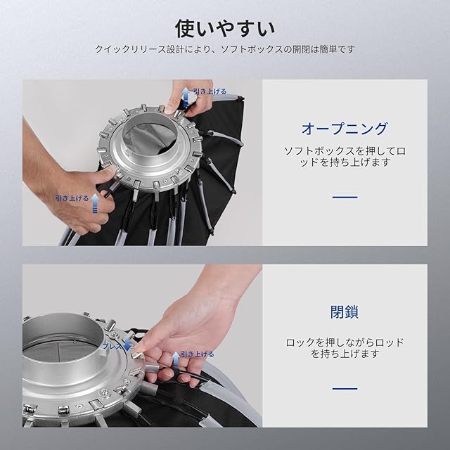 【クイックリリース&フォールド構造】このソフトボックスは16本の非常に弾力性のあるリブにより、比類のない耐久性と非の打ちどころのない放物線形状を実現しています。何年も使用しても変形することなく、何万回のプレスに耐えることができます。クイックリリース設計により、工具を使わずに15秒以内にソフトボックスをセットアップできます。折り畳み式で重量がわずか1.5kgのソフトボックスは、付属のキャリングバッグに簡単に収納して持ち運びできます。
