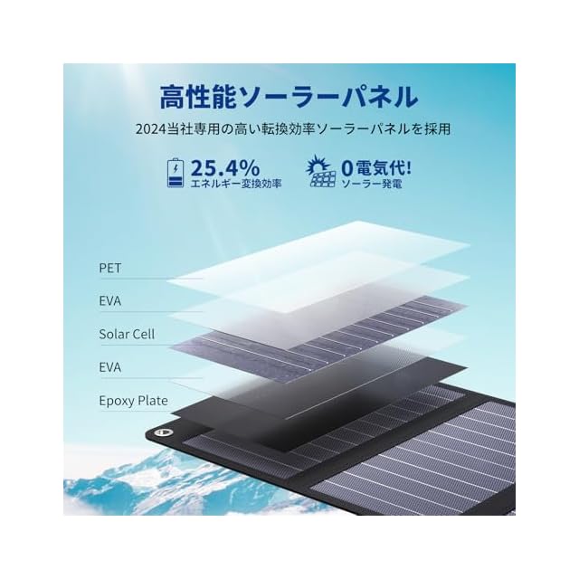 ✅【高い転換効率】 高性能ソーラーパネル:最もパワフルなSunpower社のパネルを採用、日が当たる所に置いておくだけでバッテリーなどを充電します。エネルギー変換効率は21.5%-23.5%と高く、最大の発電効率を実現できる高効率ソーラーパネルを4枚搭載し、登山、ハイキング、キャンプなどのアウトドアの利用は勿論、地震 ・ 災害時にも非常用電源としても大活躍!