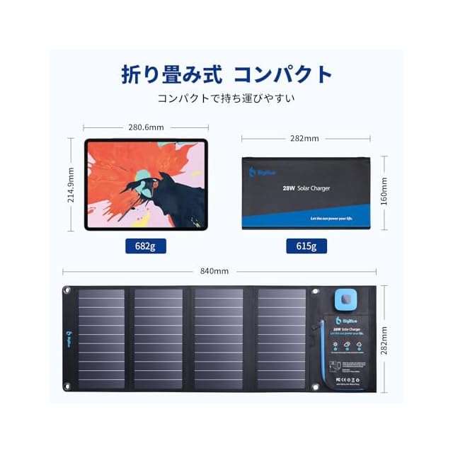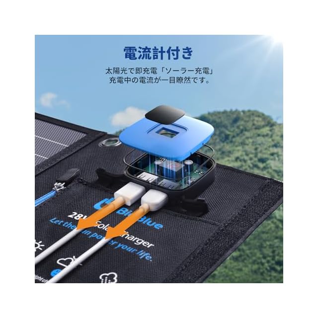 商品名:BigBlue 28W ソーラーチャージャー 電流計 ソーラー 充電器 2USBポート(5V/4.0A) ソーラーパネル 折り畳み式 防水 カラビナ付き 地震 災害時 アウトドア iPhone iPad Android各種対応(B401E-28)