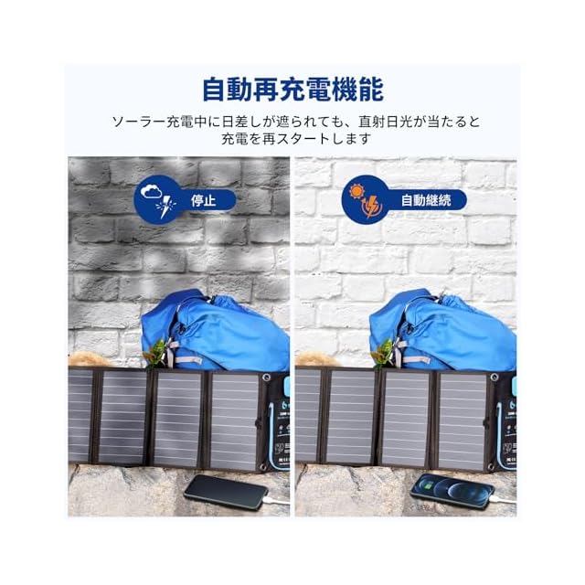 ✅【Smart IC技術とオートリトライ機能】BigBlue独自Smart IC技術により、各USBポートは接続されたスマホなどを自動的に検知し、最適な電流で急速充電を行います。オートリトライ機能とはデバイスへ充電する時、雲りで発電量が下がると天気が回復して発電量が自動的に增えることができます。晴れと曇りに相互変わるときにソーラー充電ケーブルを設置する必要がなく、自動的に充電を再スタートします。 軽量でよりポータブルな構造を採用したことにより距離旅行や登山、キャンプ、 ハイキング、BBQなどのアウトドアに最適なつくりとなっております。地震 ・ 災害時にも非常用電源としても大活躍!