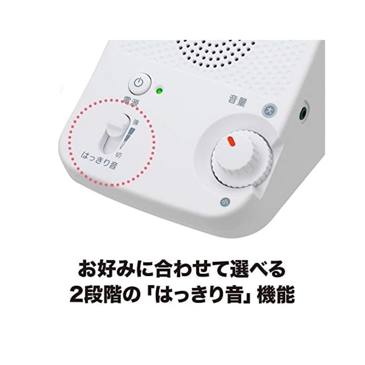【 かんたん操作 】電源ボタン、ボリュームノブ、「はっきり音」スイッチのシンプルな操作設計。