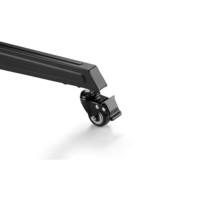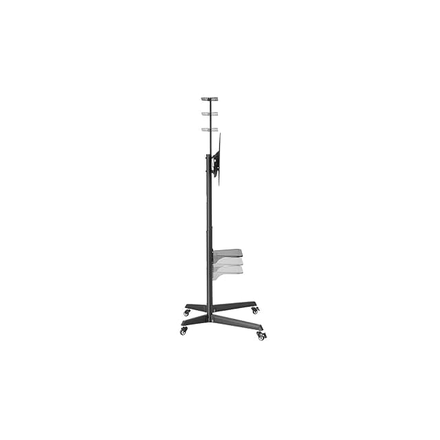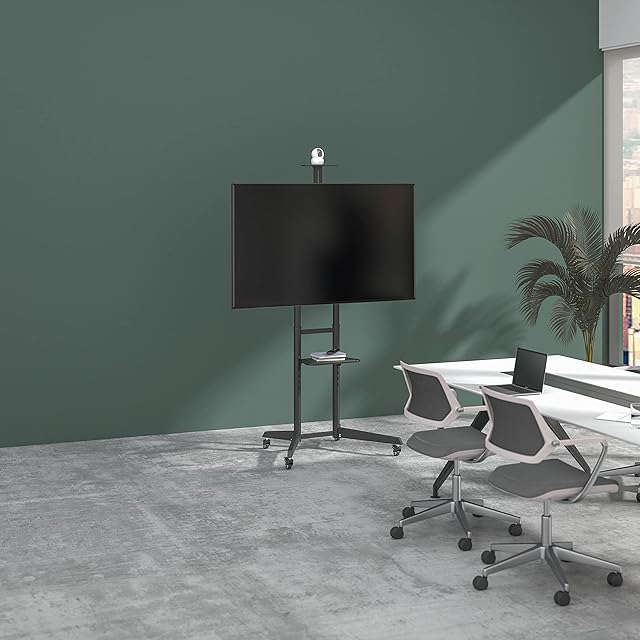 ロック機能付の可動脚で移動も楽々。背面上部に位置する簡易棚付属でWebカメラ設置にも