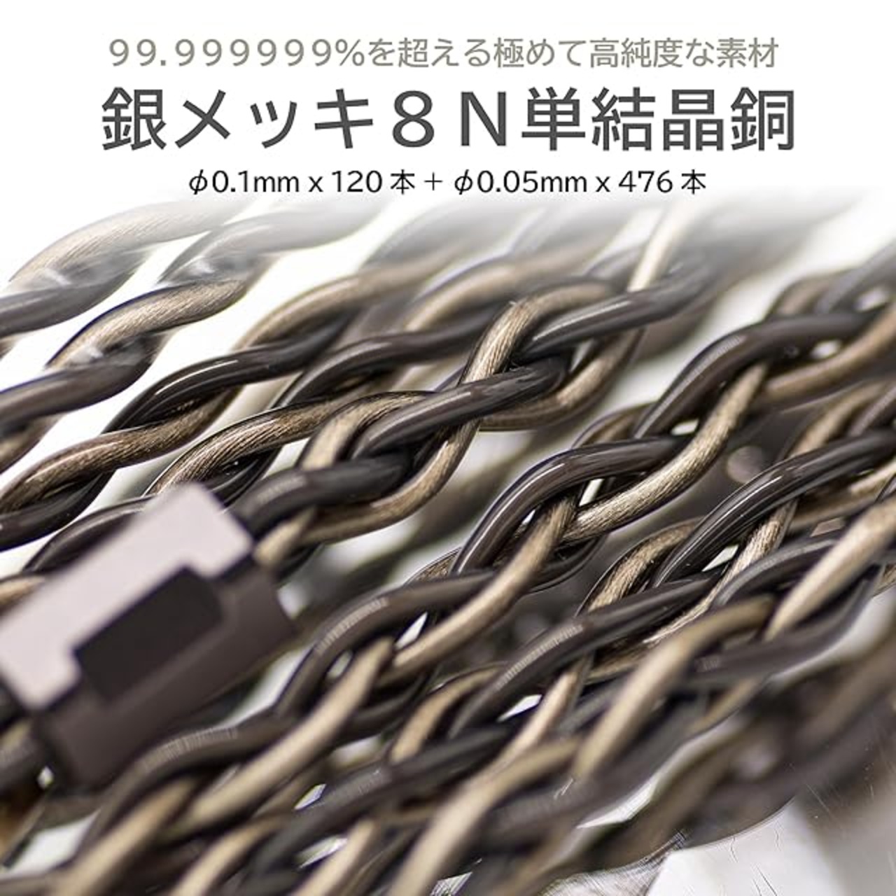 【銀メッキOCC φ0.1mm x 120本 + 銀メッキOCC φ0.05mm x 476本】8Nグレードの高純度単結晶銅(OCC)に銀メッキを施した導体を採用。厳選された原材料を用いて介在物や不純物の混入を厳しく管理した工程で鋳造された高品質導体です。
