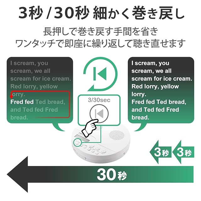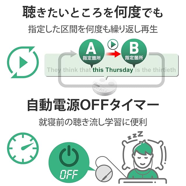 一定区間を繰り返し再生できるA-Bリピート機能を搭載。リピートしたい区間を設定するだけで、何回も自動で繰り返し再生されるので、聴き取りや書き取り学習にとても便利です