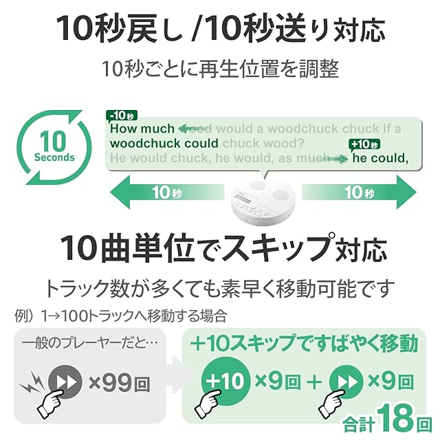 +10スキップボタンで、トラック数の多いリスニングCDでも、10トラックごと移動できるので、すぐに再生したいトラックを選択できます