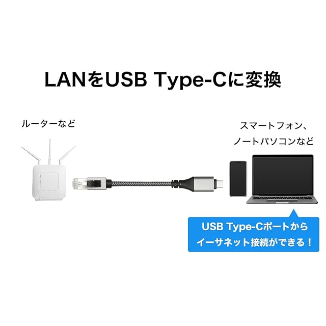 ●コネクタ形状:USB Type-C(オス)-RJ-45(オス) ●最大通信速度:1Gbps