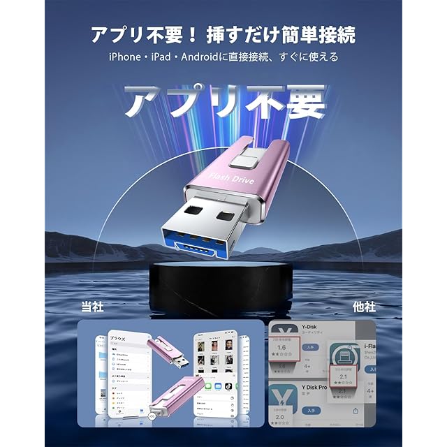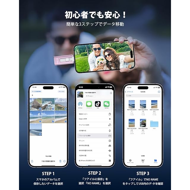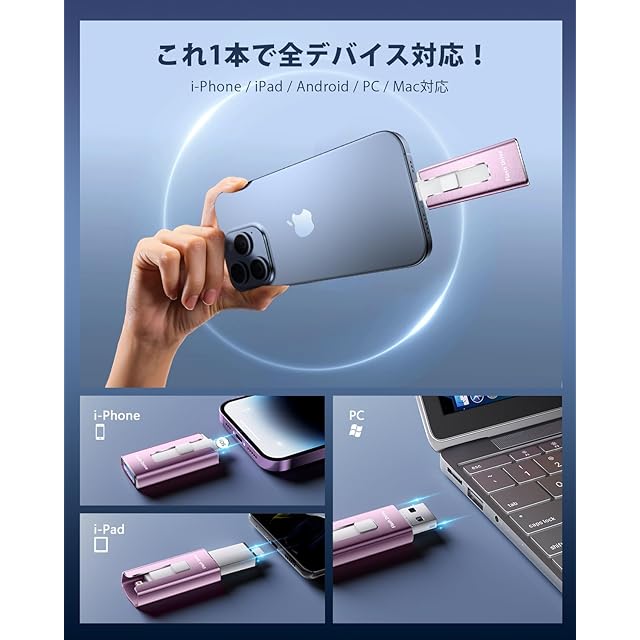 【アプリ不要!Phoneから直接usbメモリに写真保存できる神アイテム】このPhone対応usbメモリは、専用アプリ不要で、PhoneやiPad、Androidスマホ、Windows PC、Macに直接接続できるため、複雑な設定やネット環境がなくてもPhoneの写真や動画を即座に保存できます。操作も「接続→選択→保存」の簡単3ステップで、機械に不慣れな方でも使いやすいです。Phoneてテータ保存usbとして、iCloudに頼らずに旅先や日常の思い出をスマートにバックアップできる便利なスマホusbメモリです。