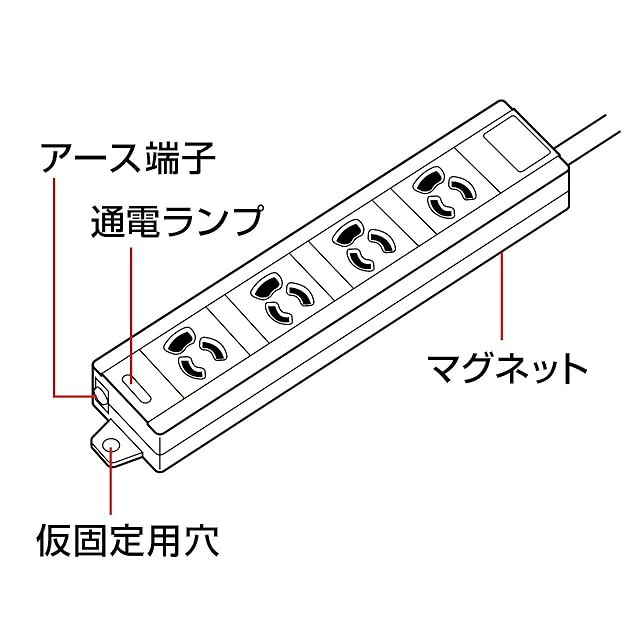 3P 4個抜け止めマグネット、通電ランプ付き電源タップ 5m