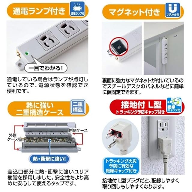 商品名:サンワサプライ 工事物件タップ 3P抜け止め・L型プラグ・マグネット・4個口 1m TAP-K4L-1