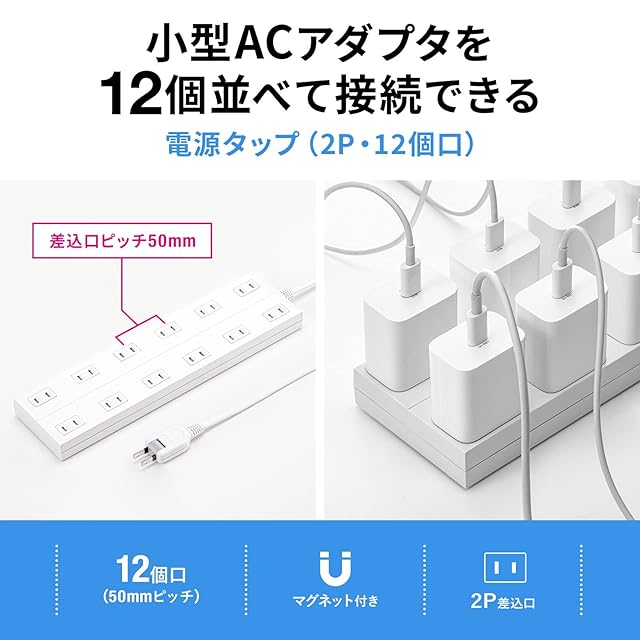 小型ACアダプタが差し込める(差込口ピッチ50mm)12個口電源タップです。※iPad(第8世代)のACアダプタが12台接続可能です。