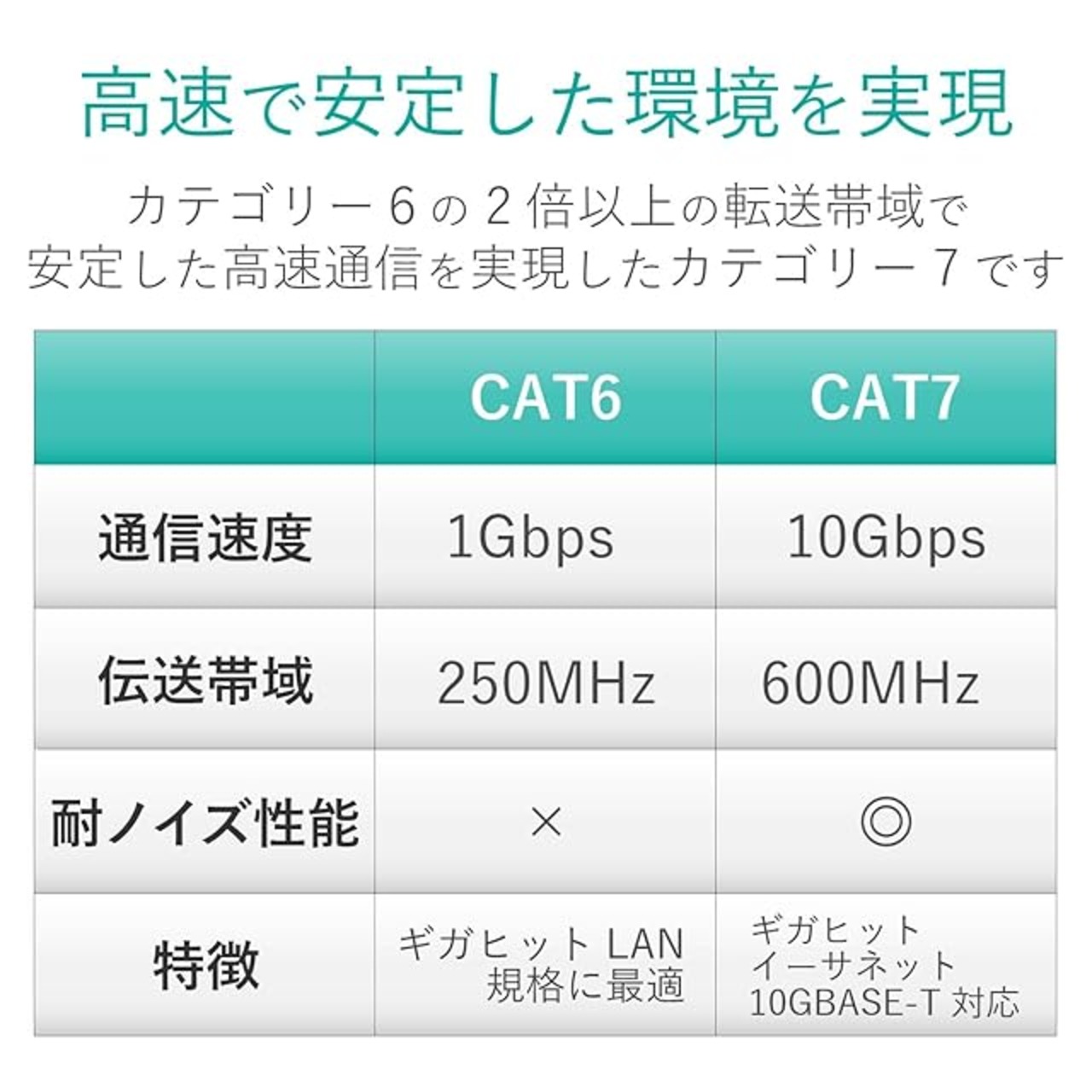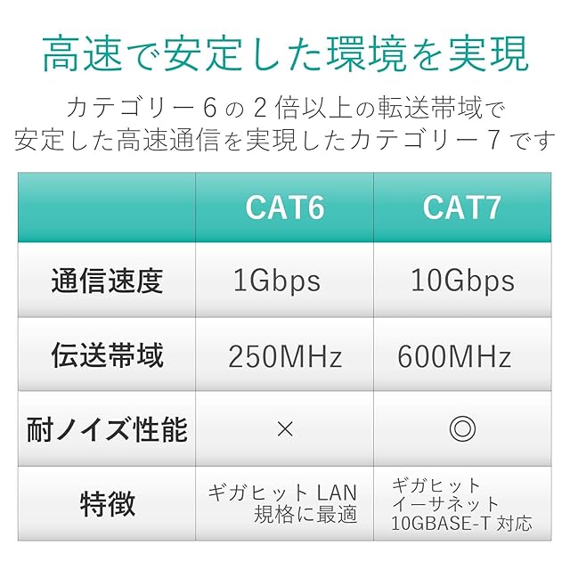 高速で安定したネットワーク環境を実現する10GBASE-Tに対応したCat7準拠LANケーブルです。