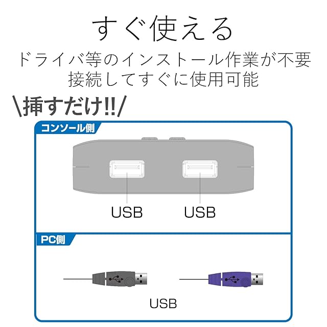 パソコン側への接続もUSB接続なので、PS/2ポートが付いていないノートパソコンも切替可能です。