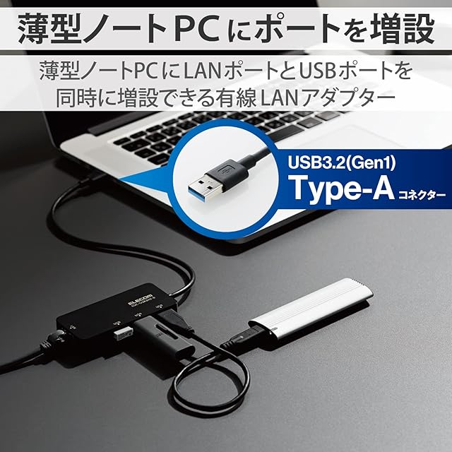 有線LANポートが無く、USBポートも不足しがちな薄型パソコンに最適。挿すだけで使えるUSB3.2 LANアダプター USBハブ付。 USB2.0搭載の従来品と比較し14.3倍の高速転送が可能。