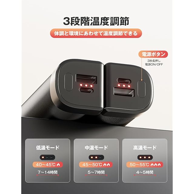 【3段階温度調節】充電式カイロは使い捨てカイロと違い、さまざまなシーンで使い分けたい人には、好みの温度に調節できます。低温(40~45℃)、中温(45~50℃)、高温(50~55℃)三段階調節可能で、机に座って作業するときは低めの45℃、通勤・通学時は中温の50℃、または特に冷え込む環境で高めの55℃に設定するなど、常に快適な温度であたたまれます。【使用時間】低温モード:約7~14時間、中温モード:約5~7時間、高温モード:約4~6時間です(2個のカイロ使用する総合時間です)(ご注意:低温火傷を防ぐため、電気カイロが高温モードで同じ場所に長時間使用しないでください。)