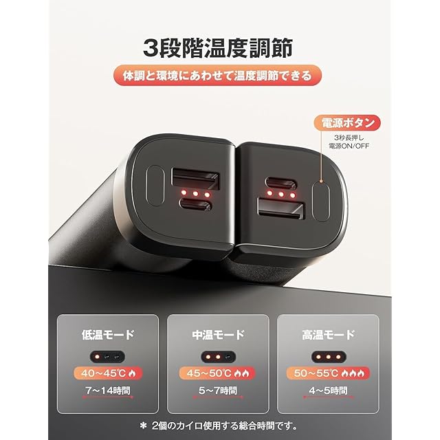 【3段階温度調節】充電式カイロは使い捨てカイロと違い、さまざまなシーンで使い分けたい人には、好みの温度に調節できます。低温(40~45℃)、中温(45~50℃)、高温(50~55℃)三段階調節可能で、机に座って作業するときは低めの45℃、通勤・通学時は中温の50℃、または特に冷え込む環境で高めの55℃に設定するなど、常に快適な温度であたたまれます。(ご注意:低温火傷を防ぐため、電気カイロが高温モードで同じ場所に長時間使用しないでください。)