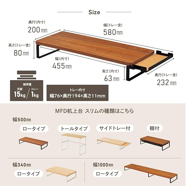 【耐荷重】15kg(等分布)、サイドトレー1kg