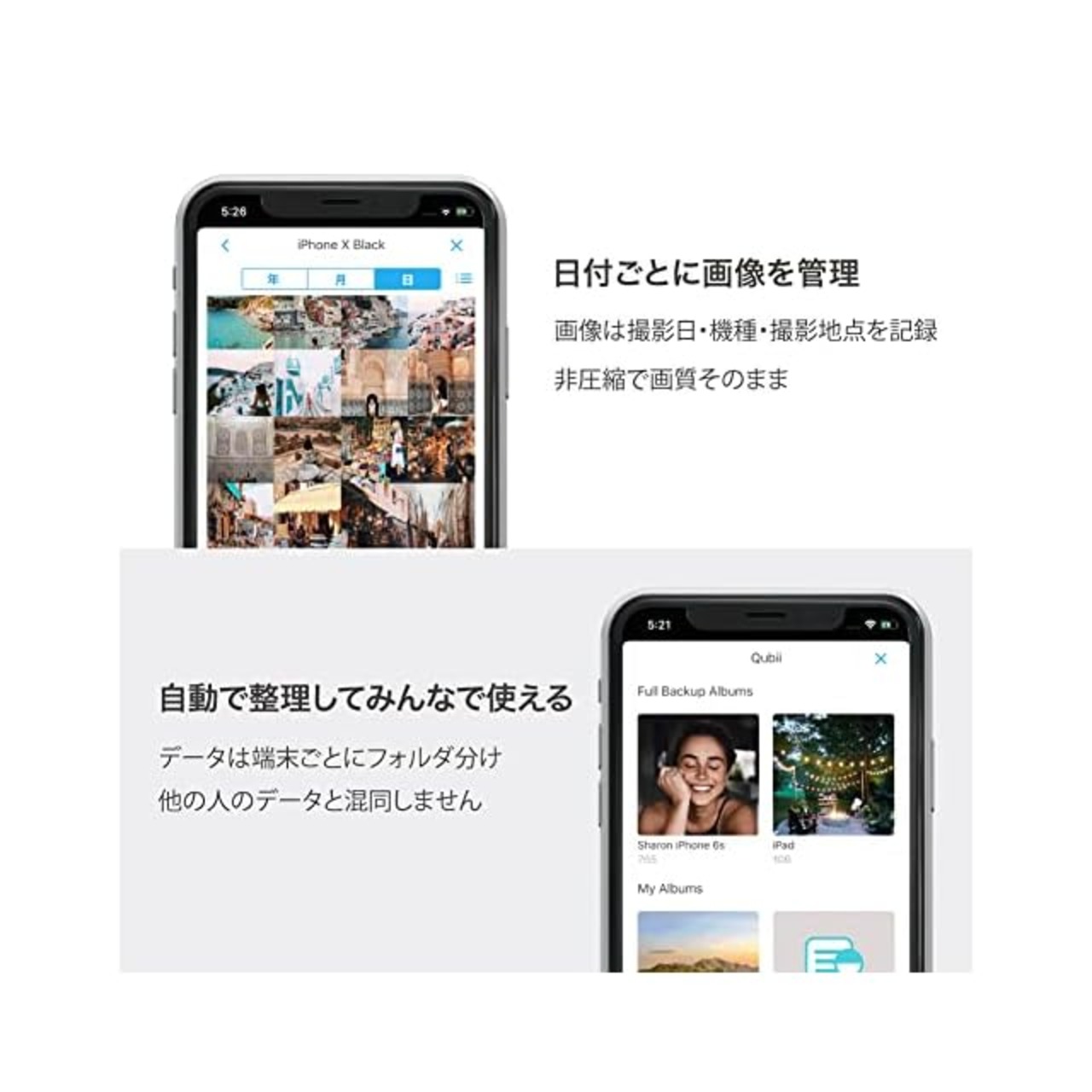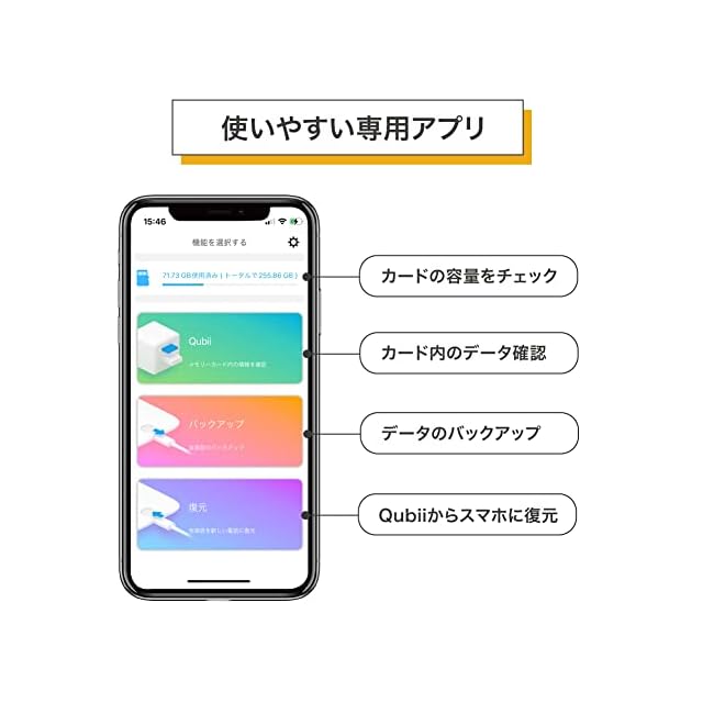 【無料&使いやすい専用アプリ】バックアップしたデータは専用アプリ「Qubii Pro」で閲覧・管理。異なるスマホで共用可能で、データが混ざることなくスッキリ管理。他のアプリを起動しながらでも使用可能です。※microSD別売