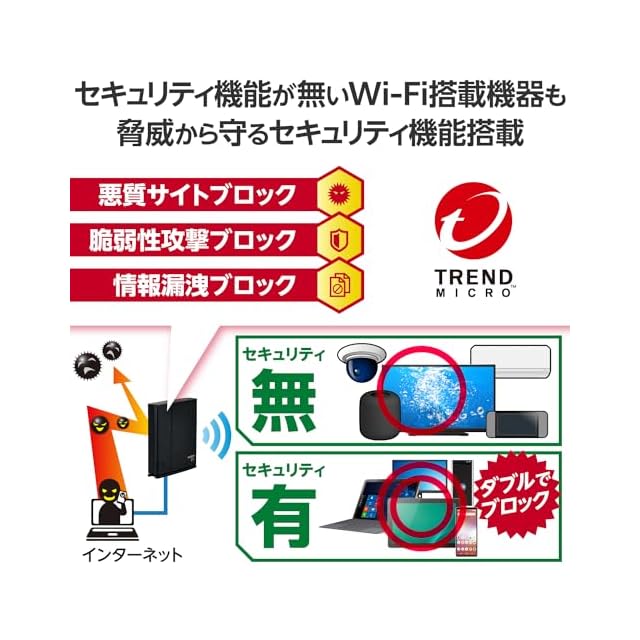 トレンドマイクロ社のセキュリティ機能「スマートホームネットワーク(TM)」搭載で、テレビやエアコン、ネットワークカメラなどのセキュリティソフトがインストールできないスマート家電をネットの脅威から守ります。