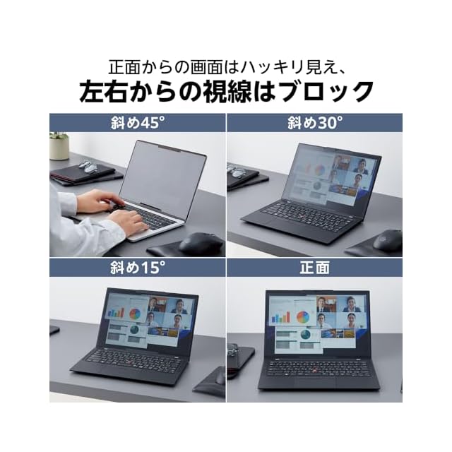 画面の正面を中心に60度(左右約30度)より外の角度からは画面がまっ黒に見えるので、パソコン画面を見られる心配がありません。